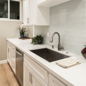 Modern Kitchen Quartz Countertops, Stainless Steel Appliances, White Shaker Cabinets, Glass Tile Backsplash Huntington Beach, California