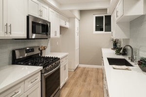 Quartz Countertops, Stainless Steel Appliances, White Shaker Cabinets, Glass Tile Backsplash