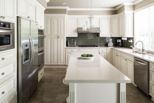 Quartz Countertops, Subway Tile Backsplash, Contemporary Stools, Stainless Steel Appliances, Custom Design Overhead Lights