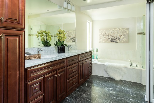 Here is a home that went through some extensive remodeling. With over $200,000 in renovations, this Turtle Rock home in Irvine went from outdated to outstanding. The home features marble and hardwood floors, paneled walls and LED lights throughout the house. Every part of the home looks brand new, from new granite countertops, stainless steel appliances and wood cabinets in the kitchen, a beautiful master bedroom and bathroom and a very cozy family room. The back patio is also a perfect area for entertaining and the family and master bedroom have perfect views for enjoying the sunset.